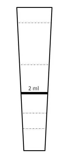 · CORTISOL EN SALIVA (NOCTURNA 23:00 hs): deberá concluir la cena a las 21:00 hs y luego debe cepillarse los dientes sin dentífrico y enjuagarse la boca con agua, dejar transcurrir 2 hs sin fumar y sin ingerir ningún alimento ni bebida. A las 23:00 hs enjuagarse nuevamente la boca con agua y recolectar un mínimo de 2 ml (ver imagen) de saliva en el tubo provisto por el laboratorio. Es importante que PERMANEZCA EN REPOSO DURANTE LA RECOLECCIÓN, luego guardar en la heladera hasta llevar al laboratorio.
